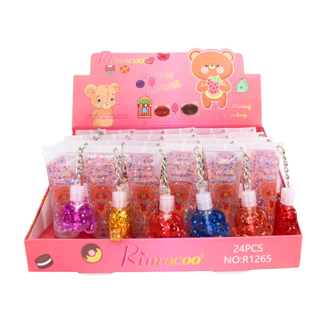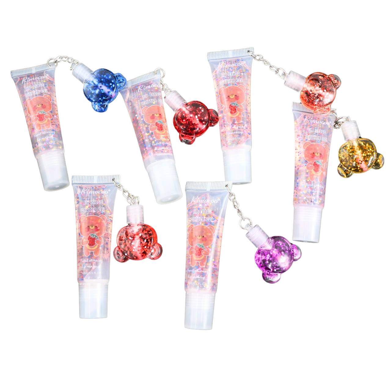 Este set de brillo labial con glitter está diseñado para mayoristas y viene en una presentación de 24 piezas. Cada brillo labial está formulado con un toque de brillo para añadir un toque de glamour a cualquier look. Además, cada brillo labial viene con un mini llavero en forma de oso, lo que lo convierte en un regalo perfecto o en un accesorio lindo para llevar en el bolso. Este producto es ideal para quienes buscan agregar un toque de brillo a su maquillaje diario y es perfecto para revender en tiendas de cosméticos o regalos.
